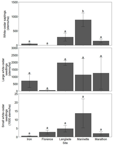 White-cedar regeneration by height class at each study site. Letters indicate significant differences (p < 0.05) in stem densities among study sites using Tukey’s HSD. Error bars indicate one standard deviation. Saplings were 1.83 m tall to less than 10 cm dbh, large seedlings were 20 cm to <1.83 m tall, and small seedlings were less than 20 cm tall. Note that y-axes differ in each row.