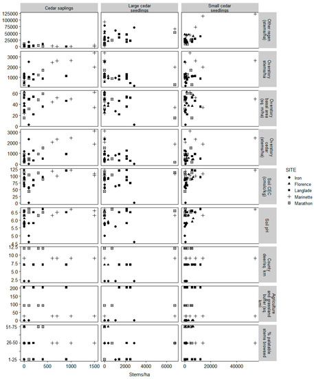 A comparison of white-cedar regeneration to all variables used as model parameters in at least one model is shown in Figure 3. Site level means for all measured variables can be found in Table A1.