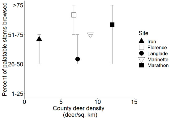 Estimated county-level deer density at each site [27] versus mean percent of palatable stems browsed at each site. Error bars indicate range of browse level across all plots in each site.