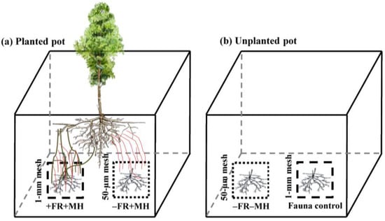 To distinguish effects of living roots from those of mycorrhizal hyphae on root litter decomposition, our experiment comprised three treatments. For treatment 1, litterbags with a 1-mm mesh size were placed into pots planted with tree seedlings, which allowed the ingrowth of roots plus mycorrhizal hyphae (‘+ FR + MH’, Figure 1a). For treatment 2, litterbags with a 50-µm mesh size were placed into pots planted with tree seedlings, which allowed the ingrowth of mycorrhizal hyphae but excluded roots (‘− FR + MH’). For treatment 3, litterbags with a 50-µm mesh size were placed into unplanted pots to exclude the effects of roots and mycorrhizal hyphae on root litter decomposition (‘− FR − MH’, Figure 1b). Mesh sizes were chosen based on typical diameters of living roots and mycorrhizal hyphae [24]. Apart from excluding root penetration, compared with 1-mm mesh, mesh size of 50-µm could inhibit the colonization of soil fauna with body-size ranging from 50-µm to 1-mm (e.g., Collembola and Acari) which could play important roles in litter decomposition [25]. Therefore, effects of living roots on litter decomposition may be confounded by those of soil fauna. To assess the potential effects of soil fauna on litter decomposition, another treatment was added in which 1-mm mesh litterbags were placed into unplanted pots (‘fauna control’, Figure 1b).