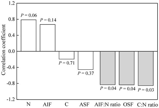 Correlation coefficients between initial chemical traits and root litter mass loss. Mass loss was measured from 50-µm mesh litterbags installed in unplanted pots (Figure 1b). Open and gray bars represent non-significant and significant results, respectively. OSF, organic soluble fraction; ASF, acid soluble fraction; AIF, acid insoluble fraction.