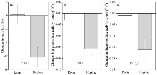 Changes in root litter mass loss (a), and activities of β-glucosidase (b) and phenol oxidase (c) induced by the presence of living roots (Roots) and mycorrhizal hyphae (Hyphae). p-values were obtained from linear mixed models analyzed across all the studied tree species, which were performed to test whether living roots significantly differed from mycorrhizal fungi in their effects on mass loss and enzyme activities. Error bars represent 95% confidence intervals (CIs). When 95% CIs do not overlap with y = 0, the presence of living roots or mycorrhizal fungi significantly affects root litter mass loss and enzyme activities.