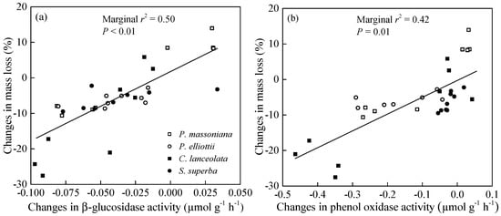 When analyzed across all tree species, compared with effects of living roots alone (calculated as differences in mass loss between the ‘+ FR + MH’ treatment and the ‘− FR + MH’ treatment), mycorrhizal hyphae (calculated as differences in mass loss between the ‘− FR + MH’ treatment and the ‘− FR − MH’ treatment) had greater inhibitory effects on root litter mass loss (p < 0.01; Figure 3a) and β-glucosidase (p < 0.01; Figure 3b) and phenol oxidase activities (p < 0.01; Figure 3c). Specifically, the presence of mycorrhizal hyphae markedly reduced root litter mass loss (−22.7%), and activities of β-glucosidase (−17.9%) and phenol oxidase (-18.8%). However, living roots alone had no significant effects on root litter mass loss (2.3%; Figure 3a), and activities of β-glucosidase (−3.0%; Figure 3b) and phenol oxidase (−1.2%; Figure 3c). Furthermore, changes in root litter mass loss were markedly positively related to changes in β-glucosidase (marginal r2 = 0.50, p < 0.01; Figure 4a) and phenol oxidase (marginal r2 = 0.42, p < 0.01; Figure 4b) activities induced by the presence of living roots and mycorrhizal hyphae.