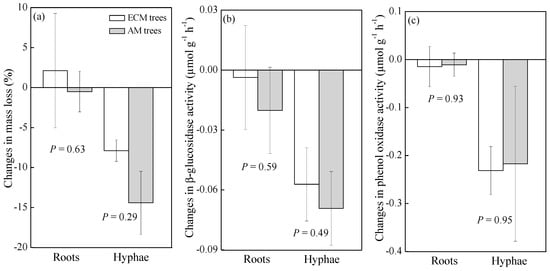 To analyze whether ECM and AM trees differed in their living root and mycorrhizal hypha effects, tree species were grouped by their mycorrhizal types. Results revealed that living roots alone of ECM or AM trees had no significant effects on root litter mass loss and enzyme activities (Figure 5). The presence of both ECM and AM hyphae induced significant decreases in root litter mass loss and enzyme activities. Furthermore, no significant differences were found between ECM and AM hyphae in their effects on root litter mass loss (p = 0.29; Figure 5a), and β-glucosidase (p = 0.49; Figure 5b) and phenol oxidase activities (p = 0.95; Figure 5c).
