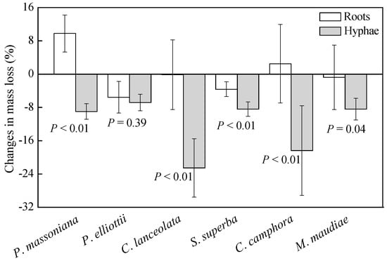 When analyzed at the tree species level, compared with effects of living roots alone, mycorrhizal hyphae had stronger inhibitory effects on root litter mass loss in five out of the six studied species (Figure 6). Mycorrhizal hyphae had significant negative effects on root litter mass loss for all the studied tree species ranging from −10.9% to −40.4%. Effects of living roots alone on root litter mass loss were mixed. Specifically, living roots of P. massoniana significantly accelerated their own root litter decomposition. For P. elliottii and S. superba, their living roots significantly inhibited their own root litter mass loss. Living roots of C. lanceolata, C. camphora and M. maudiae did not significantly influence root litter mass loss (Figure 6).
