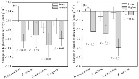 Changes in β-glucosidase (a) and phenol oxidase (b) activities induced by the presence of living roots (Roots) and mycorrhizal hyphae (Hyphae). p-values were obtained from linear mixed models conducted separately for each tree species, which were performed to analyze whether living roots significantly differed from mycorrhizal fungi in their effects on enzyme activities. Error bars represent 95% confidence intervals (CIs). When 95% CIs do not overlap with y = 0, the presence of living roots or mycorrhizal fungi significantly affects enzyme activities.