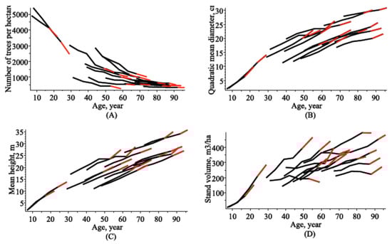 All trees in each sample plot were numerically numbered. Two measurements of diameter at breast height (1.3 m above root collar) were made (at right angles to one another) to the nearest 0.1 cm using calipers and a mean was calculated. The total tree height in each plot was measured by using a clinometer to the nearest 0.5 m. The dataset was formed by including data from four to six inventories (i.e., remeasurements). The mean stand age was measured in each PES during the first inventory. For each PES, we calculated the number of growing trees per hectare (N), the quadratic mean diameter (dq), and mean stand height (hm). Since PESs observation periodic intervals are short, the forecast validation technique is based on a dataset composed from the last remeasurement of all PES. Validation dataset gives the best indication of the accuracy that can be expected when forecasting the future. The dataset in the estimation period (without the last remeasurement) are used to estimate model parameters. The dynamics of the number of trees per hectare (N), quadratic mean diameter (dq), and mean stand height (hm) are presented in Figure 1 for the estimation (in black) and validation (in red) datasets. The site productivity index estimated by mean height at the base age varied from 19 to 33 m and based on mean diameter at the base age varied from 21 to 43 cm [33].
