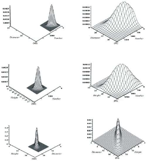 Whole stand growth and yield modeling is still facing many challenges among which their complexity including interactions between various stand size components. This paper provides the state of art on advanced modeling on how stand size components (the number of trees per hectare, quadratic men diameter and mean height) interact. It is well-known that height growth is less sensitive to competition than diameter growth, so that height-diameter relationships vary depending on past stand densities [38]. This statement confirms that univariate stand size component relationships are unsatisfactory for the modeling of stand volume and biomass. The limitation of univariate methods for the frequency analysis of diameter (or height) has attracted the attention of foresters in recent decades [39,40]. Moreover, it is necessary to consider multivariate probability problems, since they can easily connect univariate marginal and conditional distribution probability density functions of stand density, quadratic mean diameter and mean height with their multivariate probability distributions.