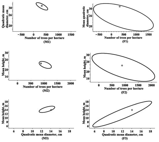 The 95% confidence regions with the observed data point for three randomly selected: (M1–M3) mixed effects scenario; (F1–F3) fixed effects scenario; (M1,F1) the first stand, quadratic mean diameter and number of trees per hectare; (M2,F2) the second stand, mean height and number of trees per hectare; (M3,F3) the third stand, mean height, and quadratic mean diameter.