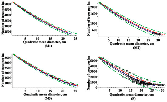 Relationships between the number of live trees per hectare (declining over age) and the quadratic mean diameter (increasing over age). (M1) mixed effects scenario for the first stand; (M2) mixed effects scenario for the second stand; (M3) mixed effects scenario for the third stand; (F) fixed effects scenario for all stands; solid-blue line—the third 0.5-quantile scenario; dash-red line—the second 0.75-quantile scenario; dot-black line—the first 0.25-quantile scenario; dashdot-green line—the 0.05-and 0.95-quantile scenarios; circle—observed values.