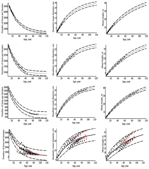 Mean of response variable dynamics and mean ± 2 standard deviations with observed data points. Mean response variable prediction trend from initial age to observed stand age—solid line and forecast trend from this age forward—dot line, for three randomly selected stands (from first till third row). First row—mixed effects scenario for the first stand; second row—mixed effects scenario for the second stand; third row—mixed effects scenario for the third stand; last row—fixed effects scenario for all stands; mean ± 2 standard deviations—dash; estimation dataset—black circles, validation dataset—red circles.