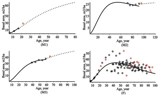 Evolution of basal area over age. (M1) mixed effects scenario for the first stand; (M2) mixed effects scenario for the second stand; (M3) left—mixed effects scenario for the third stand; (F) fixed effects scenario for all stands; black solid line—stand basal area prediction curve; black dot line—stand basal area forecast curve; black circles—estimation dataset, red circles—validation (forecast) dataset.