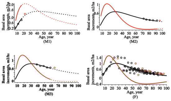 Evolution of current and mean annual basal area increments over age. (M1) mixed effects scenario for the first stand; (M2) mixed effects scenario for the second stand; (M3) mixed effects scenario for the third stand; (F) fixed effects scenario for all stands; black solid line—MAIG prediction curve; black dot line—MAIG forecast curve; red solid line—CAIG prediction curve; red dot line—CAIG forecast curve; black circles—estimation dataset, red circles—validation (forecast) dataset.