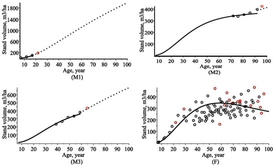 Evolution of stand volume per hectare over age. (M1) mixed effects scenario for the first stand; (M2) mixed effects scenario for the second stand; (M3) mixed effects scenario for the third stand; (F) fixed effects scenario for all stands; black solid line–stand volume prediction curve; black dot line–stand volume forecast curve; black circles–estimation dataset, red circles–validation (forecast) dataset.