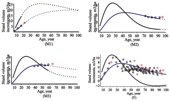 Evolution of current and mean annual stand volume increments over age. (M1) mixed effects scenario for the first stand; (M2) mixed effects scenario for the second stand; (M3) mixed effects scenario for the third stand; (F) fixed effects scenario for all stands; black solid line-CAIV prediction curve; black dot line–CAIV forecast curve; blue solid line-MAIV prediction curve; blue dot line–MAIV forecast curve; black circles–estimation dataset, red circles–validation (forecast) dataset.