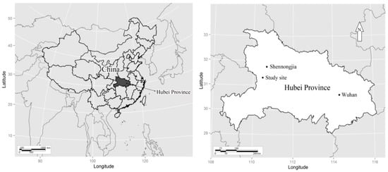 This study was conducted during the growing season (May to October) of 2014 within a mixed evergreen and deciduous broadleaved forest in Central China. The study area was located in the Shennongjia Biodiversity Research Station of the Chinese Academy of Sciences, in the northwestern portion of Hubei Province in Central China (110°28′27″ E, 31°18′23″ N). The mean elevation of the research site was 1650 m above sea level (Figure 1). Importantly, the research sitewas located within the transition zone between the northern subtropical zone and the mid-subtropical zone. The area has been noted as an important global biodiversity hotspot [31]. The climate is humid with a hot summer. According to Köppen Classification [31], it is classified as warm temperate climate. Average annual precipitation, mean temperature and relative humidity are 1350 mm, 10.6 °C, and 75%, respectively. The majority (85%) of the precipitation is distributed from May to October.