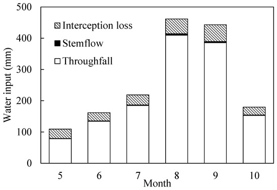 Between 1 May and 31 October, 48 discrete rainfall events resulted in a total of 1374.0 mm of rainfall. The precipitation during this period was 20% higher than mean growing-season precipitation. The maximum and minimum rainfall inputs were recorded in August (461.8 mm) and May (109.3 mm), respectively. Throughfall accounted for the largest portion of bulk precipitation volume across all six months of monitoring (the yield of throughfall was 1335.1 mm during the monitoring period), and the proportion occurring as throughfall ranged from 72.1% to 88.7% with a mean of 84.8%. Interception loss was the second rainfall fraction, and total interception loss was 225.5 mm, representing 14.3% of bulk precipitation. Stemflow yield was very small, the amount was only 13.4 mm, accounting for 0.5% of bulk precipitation in May, and 1.0% in August, which accounted for a total of 0.9% of bulk precipitation across the study period (Figure 3).