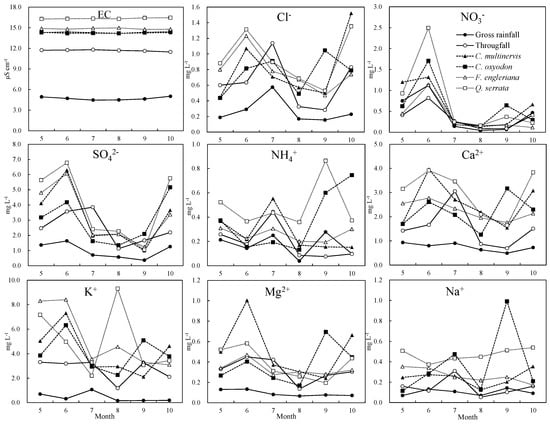 Electrical conductivity (EC) of bulk precipitation was lower than throughfall and stemflow, and the EC in stemflow of the two deciduous tree species was higher than that for the two evergreen tree species (Figure 4). Concentrations of elements and compounds in throughfall and stemflow were more variable over time than concentrations in bulk precipitation. Concentrations of most elements and compounds (Cl−, NO3−, NH4+, Ca2+, K+, Mg2+ and Na+) were relatively low at the beginning of the vegetation season and became higher over time. Element and compound concentrations dropped dramatically during the middle of the growing season and recovered towards the end of the growing season. Most of the elements and compounds in throughfall and stemflow were lowest in August, but were relatively higher by the end of the growing season.