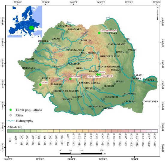 European larch (Larix decidua Mill.) has a disjunctive distribution in Europe, with a center in the subalpine belt of the Central Alps, extending from southeastern France and southwestern Italy to eastern Poland and central Romania, in a large altitudinal range, from 160 m in the Polish lowland to 2900 m altitude in the western Alps [17] The total natural area of European larch in Romania is small, representing only 0.3% of the national forest area [18], whereas in Europe it represents 1% of total forest and 4% of coniferous forest. On the other hand, in Romania as in many other European countries, European larch was introduced in many new locations outside its natural range, but also its native range has been extended by foresters [19,20]. European larch has been traditionally used due to its high-quality wood, resistance to rot, durability, strength, and moderately high density, with excellent toughness and stiffness. Due to its fast growth rate, frugality, and pioneer characteristics, it is highly indicated in reforestation and afforestation programs. Besides its interest as an important timber species in Europe, L. decidua also has a high potential as an ornamental tree, much appreciated as being one of the few coniferous species with deciduous foliage with changing colors, frequently used not only in forest landscaping but also in many urban areas.
