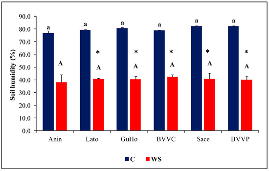 Pot substrate humidity (%) after one month of treatments of six Romanian provenances of L. decidua (Mean ± SE, n = 5). Comparing provenances, different lowercase letters indicate significant differences between control plants, and different uppercase letters indicate significant differences between drought-affected plants, according to Tukey’s test (α = 0.05). Asterisks indicate a significant difference between treatments within the same provenance, according to the LSD value for the interaction (p = 0.05).