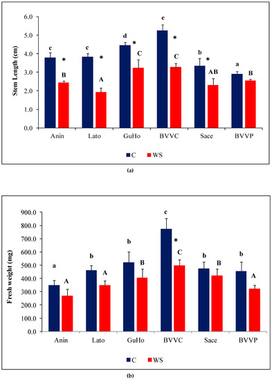 Mean seedling length varied significantly under control conditions, from 2.9 cm (provenance BVVP) to 5.3 cm (provenance BVVC) as can be seen in Figure 3a. One month of drought affected seedlings’ growth, as the stem length of affected plantlets of five provenances showed a significant relative decrease in comparison to their respective controls (Figure 3a). The degree of this decrement, however, was not uniform in the studied provenances, as BVVP seedlings recorded a non-significant decrease of 12% in stem length under drought stress, whereas in the Lato provenance a 50% decrease was observed under similar conditions. In the remaining provenances, the stress-induced reduction of SL was roughly one-third.