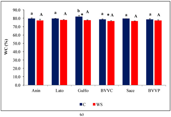 Growth parameters of six Romanian provenances of L. decidua after one month of applied drought stress (Mean ± SE, n = 5): (a) Stem length elongation (cm); (b) Needles fresh weight (mg); (c) Needles water content percentage (WC). Comparing provenances, different lowercase letters indicate significant differences between control plants, and different uppercase letters indicate significant differences between drought-affected plants, according to Tukey’s test (α = 0.05). Asterisks indicate a significant difference between treatments within the same provenance, according to the LSD value for the interaction (p = 0.05).