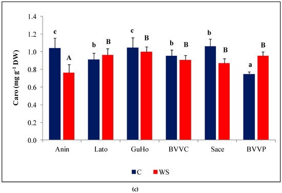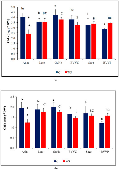Photosynthetic pigments showed a small but significant variation among provenances, both in control and drought treatments (Figure 4), but drought induced a significant reduction of Chl a and Chl b only in plants from the Anin provenance (Figure 4a,b). Caro showed only small, non-significant variations in all analyzed provenances (Figure 4c).