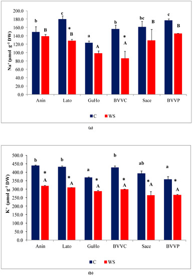 Upon the drought treatment, mean Na+ contents decreased in the needles of plants from all six European larch provenances (Figure 5a), although the decrease with respect to the values measured in their respective controls was only significant in provenances Lato (28%) and BVVC (35%). Needle K+ levels also decreased in response to drought, in plants across all studied provenances (Figure 5b), and this reduction was significant in all provenances. It must be noted, however, that the K+ control levels in needles were approximately double those of Na+. The decrement of K+ contents with respect to control values ranged between 30% and 35% in the selected L. decidua provenances.
