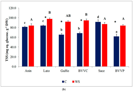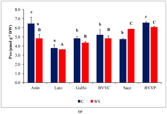 Pro concentrations varied significantly between provenances, both in control and stressed seedlings; within each provenance, however, Pro contents remained nearly unchanged in response to the water deficit treatment, except for a significant decrease in stressed plantlets of provenance Anin (Figure 6a). On the other hand, TSS contents in the needles of water-stressed plantlets recorded a significant increase, as compared to the corresponding non-stressed controls, in all studied provenances except Anin and Sace (Figure 6b). Provenances BVVC, BVVP, and GuHo showed the largest relative increase of TSS, nearly 40%, in comparison to their controls.