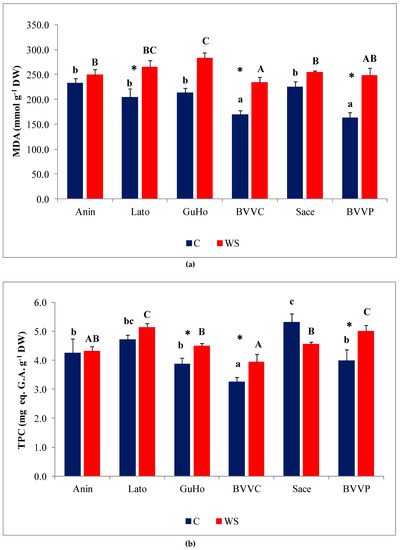 MDA, a reactive aldehyde generated by increased free-radical production is considered as a suitable biomarker of cellular oxidative stress [68] and was reported to increase under salt and drought stress in European larch [40,47]. The results presented here indicate that it could be considered as a marker of mild drought stress in L. decidua, as it increased in all provenances except the two that were not so much affected by stress. Phenolics, especially flavonoids, are strong antioxidants in plants, belonging to the secondary ROS scavenging systems that are activated only when the activity of the antioxidant enzymes decline under severe stress [69]. In the provenances more affected by stress, total phenolics levels increased, whereas they were constant in Anin and decreased in Lato. Flavonoid variation showed the same pattern but differences were statistically significant only in the GuHo provenance.
