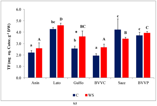 Phenolic compounds, and especially the subgroup of flavonoids, include a large number of antioxidant metabolites, which plants can use to counteract the deleterious effects of oxidative stress. Total phenolic compounds (TPC) levels increased slightly, but significantly, under water deficit conditions in three of the studied provenances of European larch (GuHo, BVVC, and BVVP (Figure 7b)). Regarding total flavonoid (TF) concentrations in the needles, they increased significantly, in response to the drought treatment, only in seedlings of the GuHo provenance, (Figure 7c).