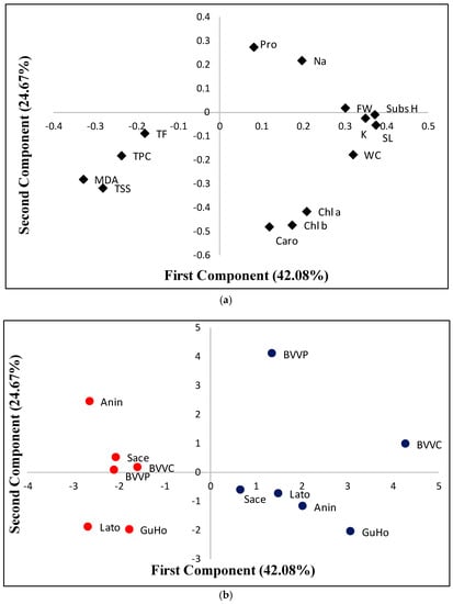 Loading (a) and score (b) plots for a principal component analysis (PCA) based on the first and second component, which respectively account for 42.08% and 24.67% of the total variability observed in six Romanian provenances of L. decidua from control plants (blue dots) or submitted to drought stress(red dots) after one month of initiation of the treatments. Subs H, substrate humidity; SL, stem length; FW, fresh weight; WC, water content; Pro, proline; TSS, total soluble sugars; Na, sodium; Chl a, chlorohyll a; chl b, chlorohyll b; caro, carotenoids; MDA, malondialdehyde; TPC, total phenolic compounds; TF, total flavonoids.