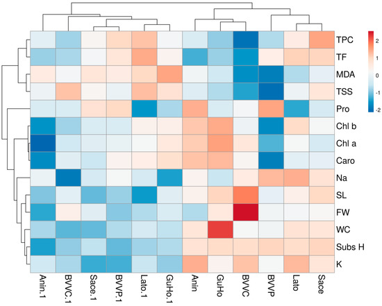 The hierarchical cluster analysis (HCA) performed together with the heatmap (Figure 9) confirmed the PCA results and revealed a clear separation of the control and drought-stressed plants in two main clusters. In addition, the cluster topology was similar under the two conditions (Figure 9). For the traits measured, the HCA separated two main clusters: one which included TPC, TF, MDA, and TSS, and the other which included the rest of traits. TPC and TF were highly correlated, and the same occurred for MDA and TSS. In the other cluster, high correlations were observed between the three photosynthetic pigments, and also between stem length (SL) and fresh weight (FW), as well as between WC, substrate humidity, and K+ contents (Figure 9).