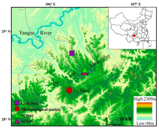 Location of the study sites in the northern part of southwest China. The sampling sites, grid data (28.75° N, 106.25° E), and nearest meteorological station (Xi Shui) are also shown. The overall location of the research region is shown in the inset map.