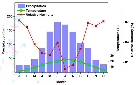 Annual climate conditions for Xi Shui station (see location in Figure 1) from 1960 to 2015 showing total monthly precipitation, mean monthly temperature, and mean monthly relative humidity.