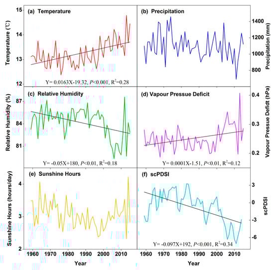 Climatic characteristic in the Xi Shui meteorological station from 1960 to 2015. (a) Annual mean temperature; (b) annual total precipitation; (c) relative humidity; (d) vapor pressure deficit; (e) annual sunshine hours; (f) Annual scPDSI. Linear regression lines and regression parameters are shown for the significant relationships (p < 0.05).