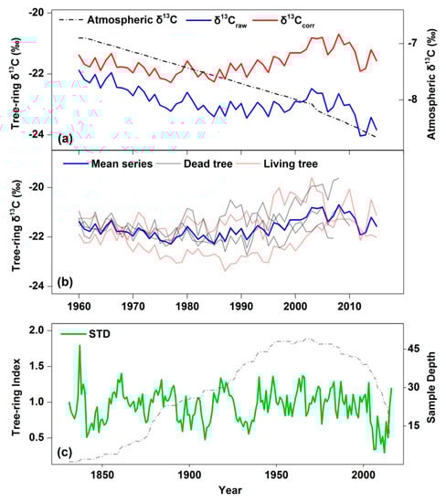 The temporal characteristics of δ13C chronology and growth chronology (STD). (a) δ13Ccorr series (red line), the δ13Craw series (blue line), and the atmospheric δ13C (dashed line) during 1960–2015; (b) individual series of dead trees (black lines) and living trees (red lines), and tree-ring δ13C chronology (blue line). (c) STD chronology (green line) and sample size (dotted line).