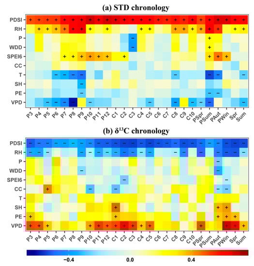Monthly correlation coefficients of δ13C and standard (STD) chronologies to climate variables from 1960 to 2015. (a) Correlation coefficients between STD chronology and relative humidity (RH), precipitation (P), wet days duration (WDD), drought index at six-month scales (SPEI06), cloud cover (CC), mean temperature (T), sunshine hours (SH), and vapor pressure deficit (VPD) from previous March (P3) to current October (C10) between 1960 and 2015. Correlations with seasonal variables are also shown. Positive and negative correlations at the 95% significantly levels are highlighted with “+” or “–” respectively. (b) Correlations between δ13C chronology and the same climatic factors used in (a).