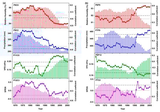 Running correlation analyses for δ13C-climate and tree growth–climate relationships. X-axis indicated the center of the 21-year moving window. Bars show the mean value of the climatic variables for each window. Lines with dotted symbol show the corresponding correlation coefficient. Dotted and dashed horizontal lines indicate significance levels at 95% and 99%, respectively. (a) 21-year running correlations between the δ13C chronology and RH (P9C5: previous September–current May), precipitation (P9C2: previous September–current February), VPD (P11C5: previous November–current May), and SPEI6 (P12C3: previous December–current March) during 1960–2015. (b) 21-year running correlations between growth (STD chronology) and RH (P6P9: previous June–September), precipitation (P7P9: previous July–September), VPD (P6P12: previous June–December), and SPEI6 (P7C2: previous July–current February) during 1960–2015. The choice of the period was based on the statistical significance of the climate–growth correlations (see Figure 5).