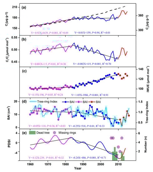 Temporal trends in Ca, Ci, Ci/Ca, BAI, and iWUE. Linear regressions are plotted for the periods 1960–1984 (purple), and 1985–2010 (blue), with their respective p and R2 values. (a) The relationship between Ci (solid line) and Ca (dash line). Temporal trend in Ci/Ca (b), and iWUE (c). (d) Temporal trend of BAI (line with dotted symbol) and STD chronology (light blue line). (e) Temporal trend of scPDSI processed with a ten-year low-pass filter. The number of dead trees (green bars) and missing rings (purple circles) are also shown.