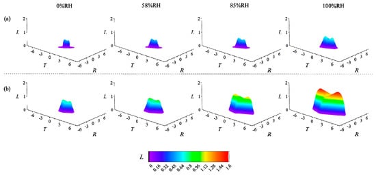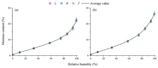 MCs of poplar and Chinese fir wood, at different RHs, are shown in Figure 1a,b. At each RH level, the average value of MC was calculated, based on the results of L, R, and T specimens. Non-significant differences was found among specimens in three directions, regardless of RH levels. At a given RH level, the MC of Chinese fir was higher than poplar. Statistical analyses was conducted, as shown in Table S1. Both poplar and Chinese fir did not reached the fiber saturation point even at the most RH level. Wood MC was influenced by chemical components in cell wall, and associated with bulk density of wood. The lower density of Chinese fir delivered much more specific surface area and void in cell wall. Consequently, Chinese fir absorbed much moisture than poplar, especially at high RH levels.