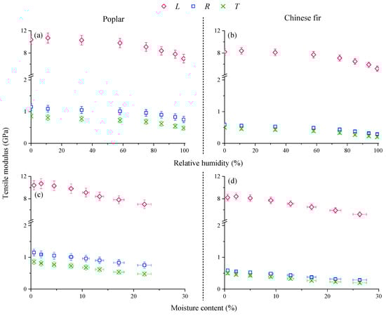 Influence of relative humidity on tensile modulus of poplar (a) and Chinese fir (b) and moisture dependence relations (c,d).