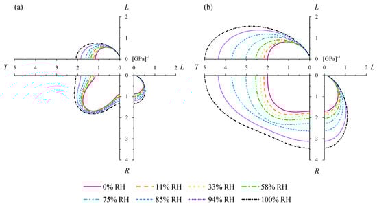 Elasticity at three orthotropic directions (L, R and T) could also be used to evaluate the elastic response when stress and strain deviated from these axes. Grimsel [43] proposed a first-time spatial illustration as “deformation body” and described the detailed transformation procedures. To demonstrate the moisture dependency of compliance, two-dimensional illustrations in the principle planes (L, R and T) of poplar and Chinese fir are presented, based on stiffness values (EL, ER, and ET) (Figure 2a,b), and values of poisson ratio and shear modulus investigated by Bao et al. [1] and Cheng [44]. In Figure 3a,b, the relationships between compliance value and RH level were clearly visible. For both poplar and Chinese fir, increases in compliance as a function of increasing RH level can be observed in axis and off-axis directions. Moreover, the moisture-dependent compliance is spatially illustrated in Figure 4a,b by comparing the hemi deformation bodies at four RH levels. The deformation body can be interpreted as follows [29]: To any arbitrarily chosen axis in the three-dimensional coordinate system, representing the L, R, and T directions of a wood species, an identical tensile load was applied. The bodies illustrated the degree of deformation depending on the load direction. By the deformation bodies, the influence of the MC on the overall deformation capability of poplar and Chinese fir wood, at a wide humidity range can be summarized effectively. Keunecke et al. [29], Hering et al. [14], Ozyhar et al. [33], Clauss et al. [30], and Jiang et al. [32] presented that the deformation body was suitable to describe the degree of the deformation dependent on the load direction.