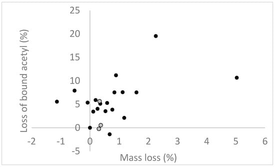 Loss of bound acetyl in acetylated pine samples exposed to R. placenta for up to 200 days, in percent of acetyl content after acetylation and related to mass loss due to degradation. Black circles: samples exposed to R. placenta; grey circles: non-exposed controls incubated on sterile soil for 8 weeks.
