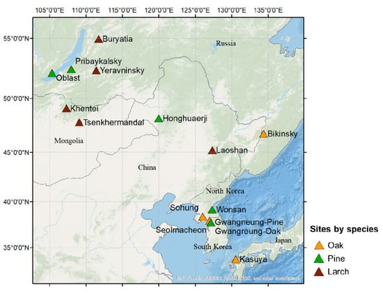To cover the MLE in Northeast Asia, we selected five pilot sites from each of the southern parts of the selected sites, including oak (Quercus spp.), pine (Pinus sylvestris and Pinus Densiflora), and larch (Larix Mongolica and Larix Sibirica) stands [35,36,37,38] (Figure 1). The study sites were distributed along latitudinal (vertical) transects. They were also located near the borders of forests with other land covers and different forest densities [7,39]. In addition, various human effects due to different management of forest activities were found from literature [6,40]. Therefore, this region has ecological and socio-economic transitions that vary according to each tree species and nation.