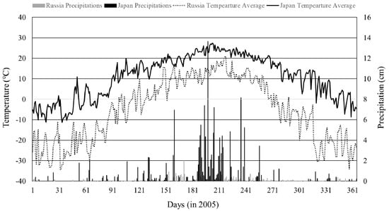Climatic characteristics of the northernmost site (Buryatia, Russia) and the southernmost site (Kasuya, Japan) in 2005.