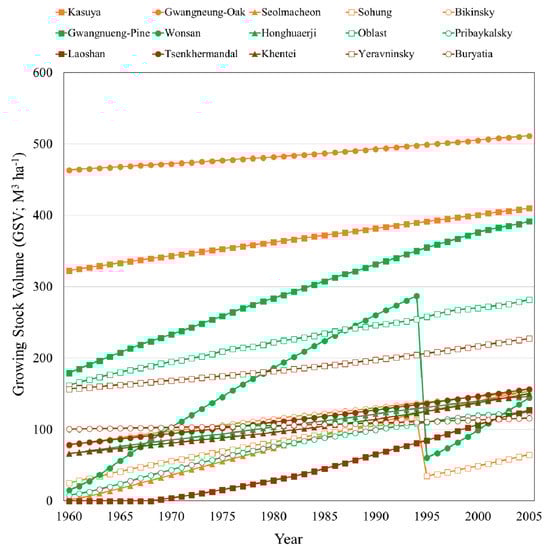 From the BGC-MAN simulations, the estimated values of the GSVs of oak forests in Kasuya (Japan), Gwangneung (South Korea), Seolmacheon (South Korea), Sohung (North Korea), and Bikinsky (Russia) were 410, 511, 154, 65, and 153 m3 ha−1, respectively, in 2005. The GSVs of pine forests in Gwangneung (South Korea), Wonsan (North Korea), Honghuaerji (China), Oblast (Russia), and Pribaykalsky (Russia) were 392, 145, 147, 282, and 124 m3 ha−1, respectively, during the same period. The GSVs of larch forests in Laoshan (China), Tsenkhermandal (Mongolia), Khentei (Mongolia), Yeravninsky (Russia), and Buryatia (Russia) were 127, 156, 150, 227, and 116 m3 ha−1, respectively (Figure 3).