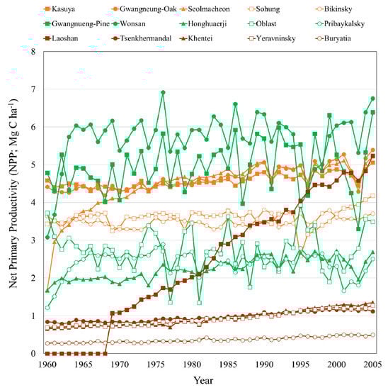 The tree volume of the Gwangneung (South Korea) pine forest was estimated from a previous DBH survey at around 378–645 m3 ha−1, and a National forest inventory (NFI) plot located near the site indicated 270 m3 ha−1 [38]. The predicted annual NPP was 5.37–7.20 Mg C ha−1 [48]. Wonsan (North Korea), which was deforested and subsequently reforested, has an annual NPP range of 4.30–6.03 Mg C ha−1 based on the VISIT model simulation [16]. The forest volume of Honghuaerji (China) was estimated as 117–173 m3 ha−1 [50]. In the case of Oblast (Russia), the forest volume was estimated at around 282 m3 ha−1, and annual NPP was estimated at around 3.06 Mg C ha−1. The GSV of forests in Pribaykalsky (Russia) was reported to be around 102 m3 ha−1, and this forest’s NPP was predicted to be 2.72 Mg C ha−1.