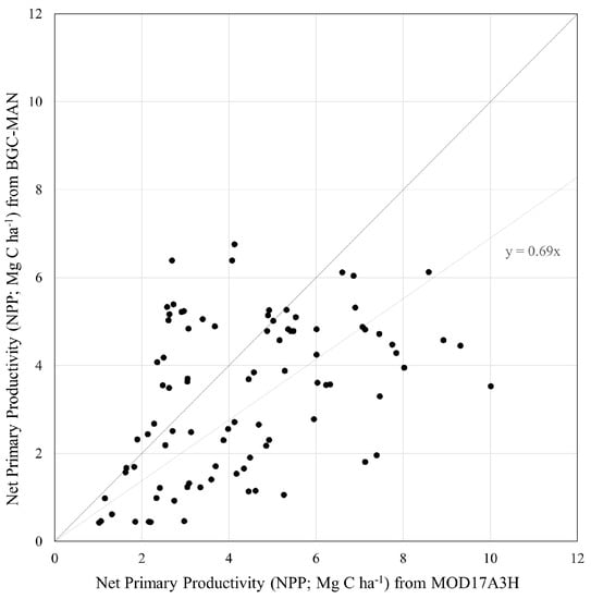 Furthermore, the simulated NPPs were compared with the Moderate Resolution Imaging Spectroradiometer (MODIS)’s NPP (MOD17A3H) product from the National Aeronautics and Space Administration (NASA), the United States [74]. Since the MOIDIS NPP product data are available from 2000 and our study has the BGC-MAN results until 2005, the six years of overlapping NPP results were compared to find the relationship (Figure 5).
