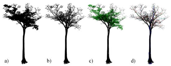 (a) Vitex spp. tree point cloud (TLS-derived H = and TLS-derived D = with POM at ), (b) down-sampled tree point cloud ( point spacing, as in Calders et al. []), (c) soft tissues (green) and hardwood (black) separated point cloud [], and (d) TreeQSM modelled after the hardwood point cloud.